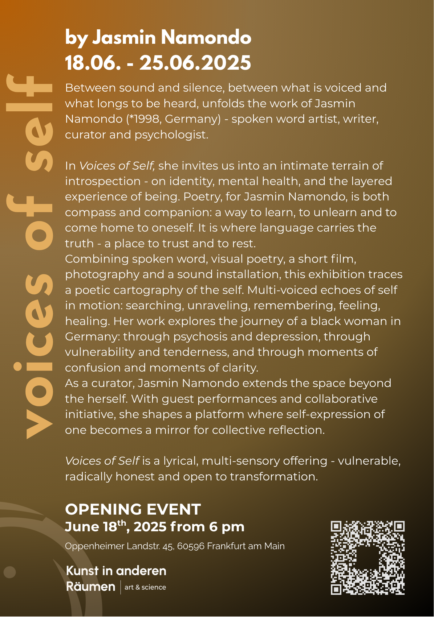 Between sound and silence, between what is voiced and what longs to be heard, unfolds the work of Jasmin Namondo (1998, Germany) - spoken word artist, writer, curator and psychologist.